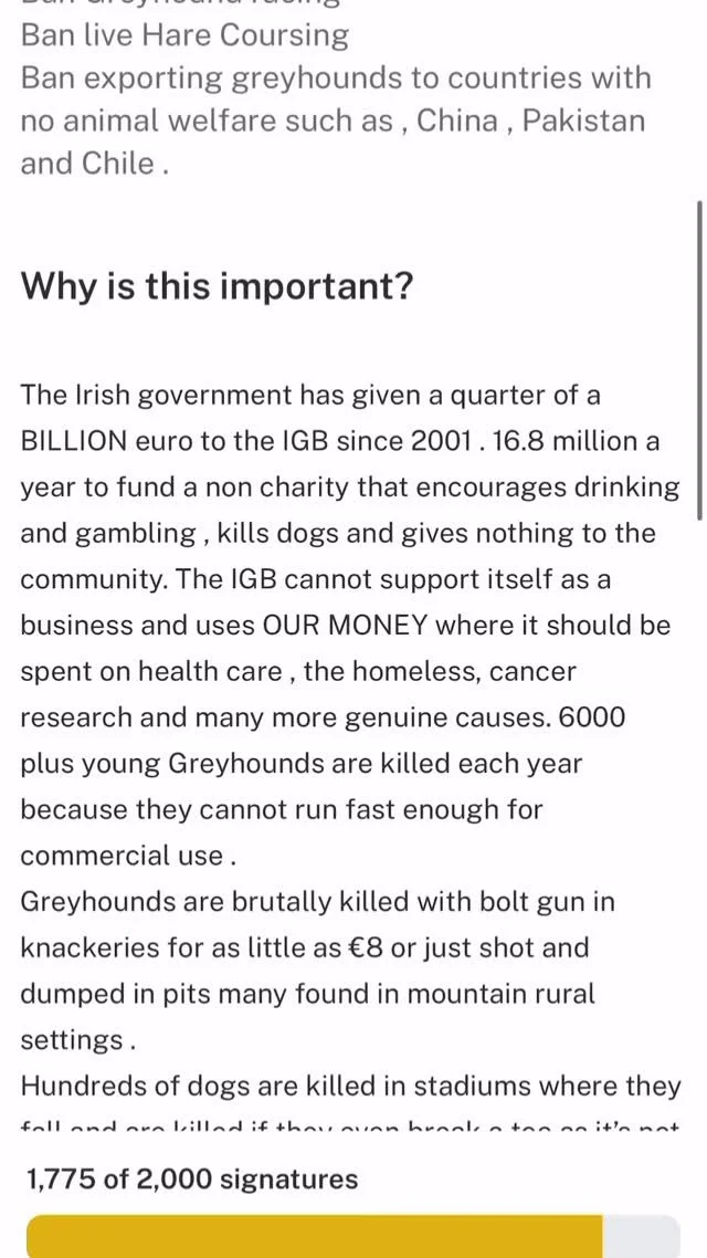 The Greyhound Racing industry is inherently cruel and barbaric. This is not a SPORT the sheer cruelty is horrific and vile. From cradle to the grave these loyal dogs suffer immense cruelty due to the racing and betting industry.